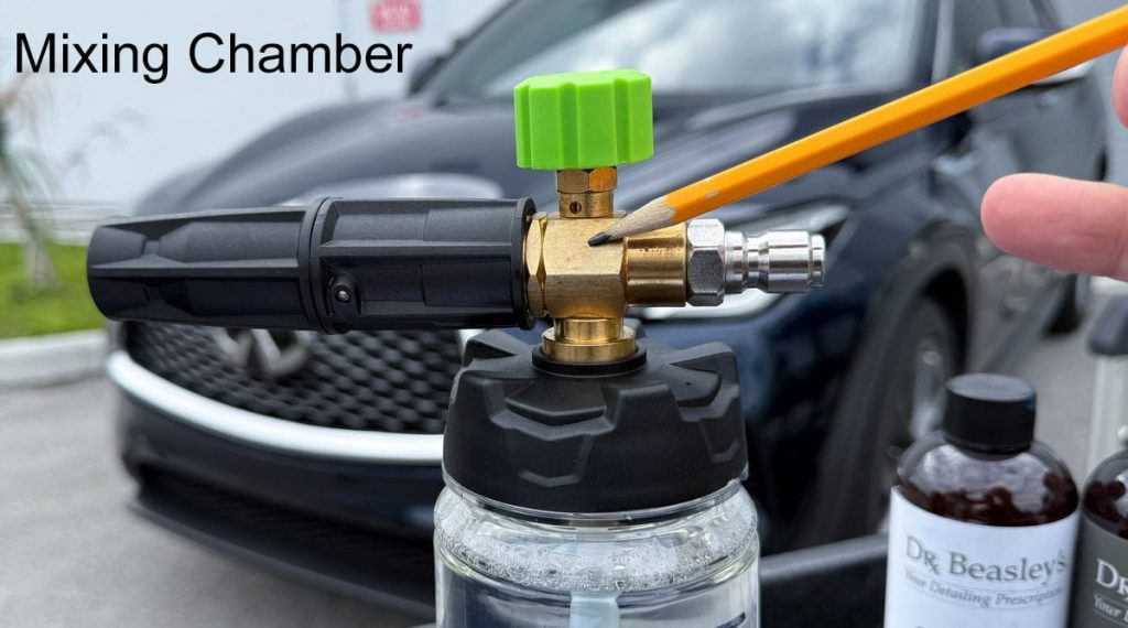 Most foam cannons have two knobs. The top knob controls the water-to-soap mixture. Turning it toward the “-” (minus) sign usually restricts water flow, resulting in thicker foam. The front nozzle adjusts the spray pattern. You want a wide “fan” spray rather than a direct stream to ensure even coverage.
