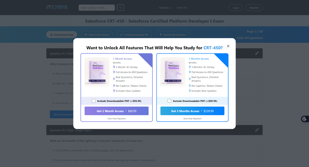 Hence, it is “One-time cost vs. recurring subscriptions” which is more advantageous. The “2x Lifetime Access” pricing model offers an excellent value in the long term. In contrast, ITExams’ monthly or multi-month plans will gradually increase in cost, and your learning will not necessarily match their length. Realism of the exam simulation The online practice mode of Certification-Exam simulates the real Salesforce test format perfectly: limited time to answer questions, continuous learning, and questions similar to those asked in the final test. The ITExams test does not have a time limit, which is a significant factor affecting your stress and stamina. Following this logic, the Certification-Exam simulator is superior to its competitor because of the timer and auto-scroll.